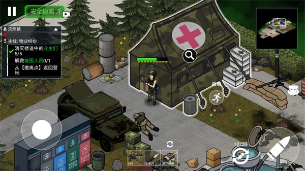 3、关卡中左侧控制角色移动,右侧拥有换弹、射击和背包按钮,屏幕下方展示武器与治疗道具,右上角为关卡地图,左上角显示当前任务。