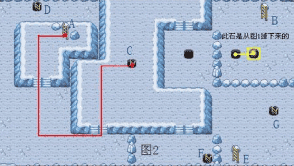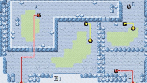 一、进入双子岛后,从出口处进入洞口出现于A点,将两块石头推进洞口,角色再走向右下角的洞口,(PS:红线为角色路线,黄线为石头进洞路线),如下图所示: